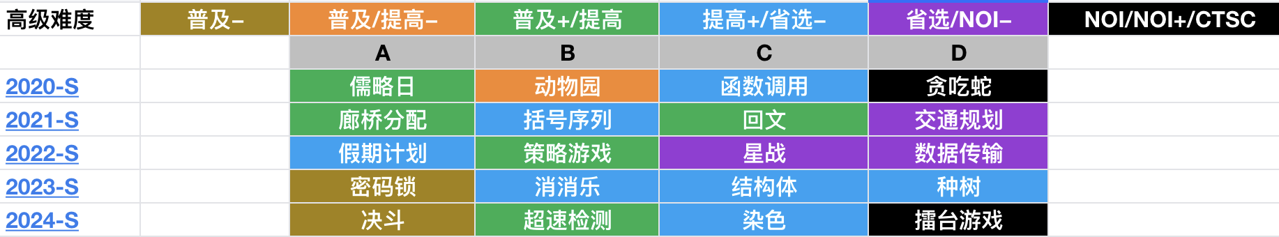 对于 CSP-S,每年有四道题,难度一般分布在 普及、提高、省选、NOI 这四个初级难度。