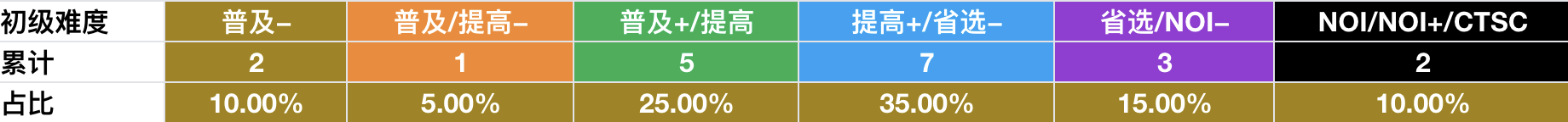 CSP-J/S 的难度依次是入门、普及−、普及/提高−、普及+/提高、提高+/省选−、省选/NOI−、NOI/NOI+/CTSC。