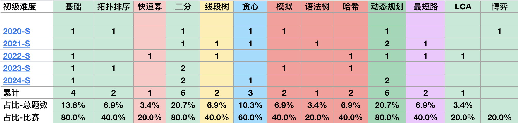 今天也打算统计一下 2020 年到 2024 年近 5 年 CSP-S 编程算法的难度和题型,从而总结出常见的题型。