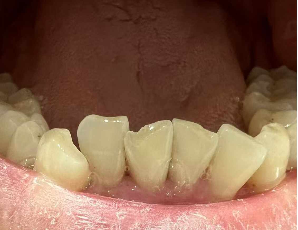 例如这是我的牙齿,牙缝里有黑色的物质,内侧的黑色物质更多。
